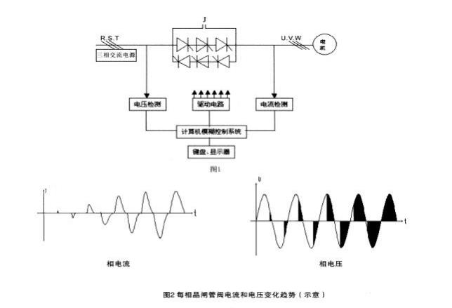 當起動完成后, 三相旁路接觸器 J 自動吸合, 電動機投入電網(wǎng)運行(見 圖 1)。輸入/輸出電壓波形和電流變化的波形